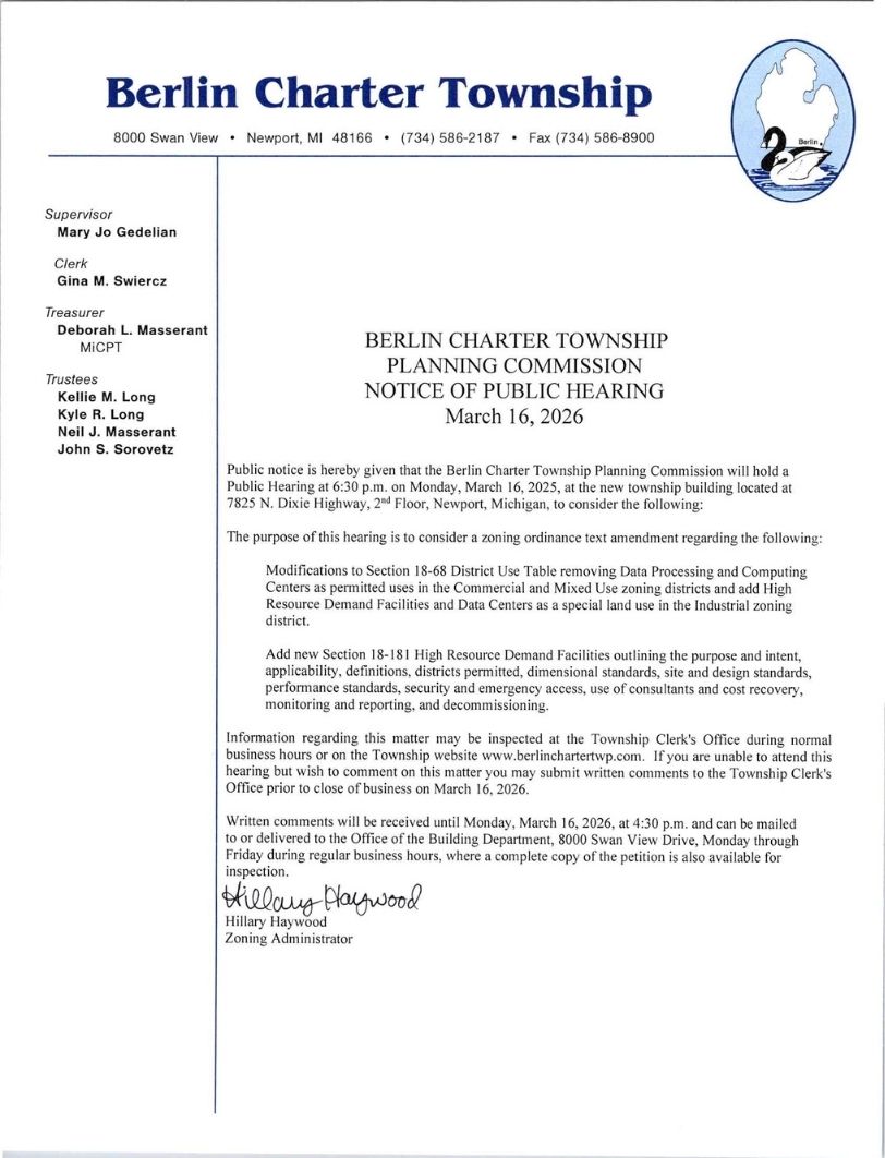Berlin Charter Township Notice of Planning Commission Notice of Public Hearing March 16, 2026